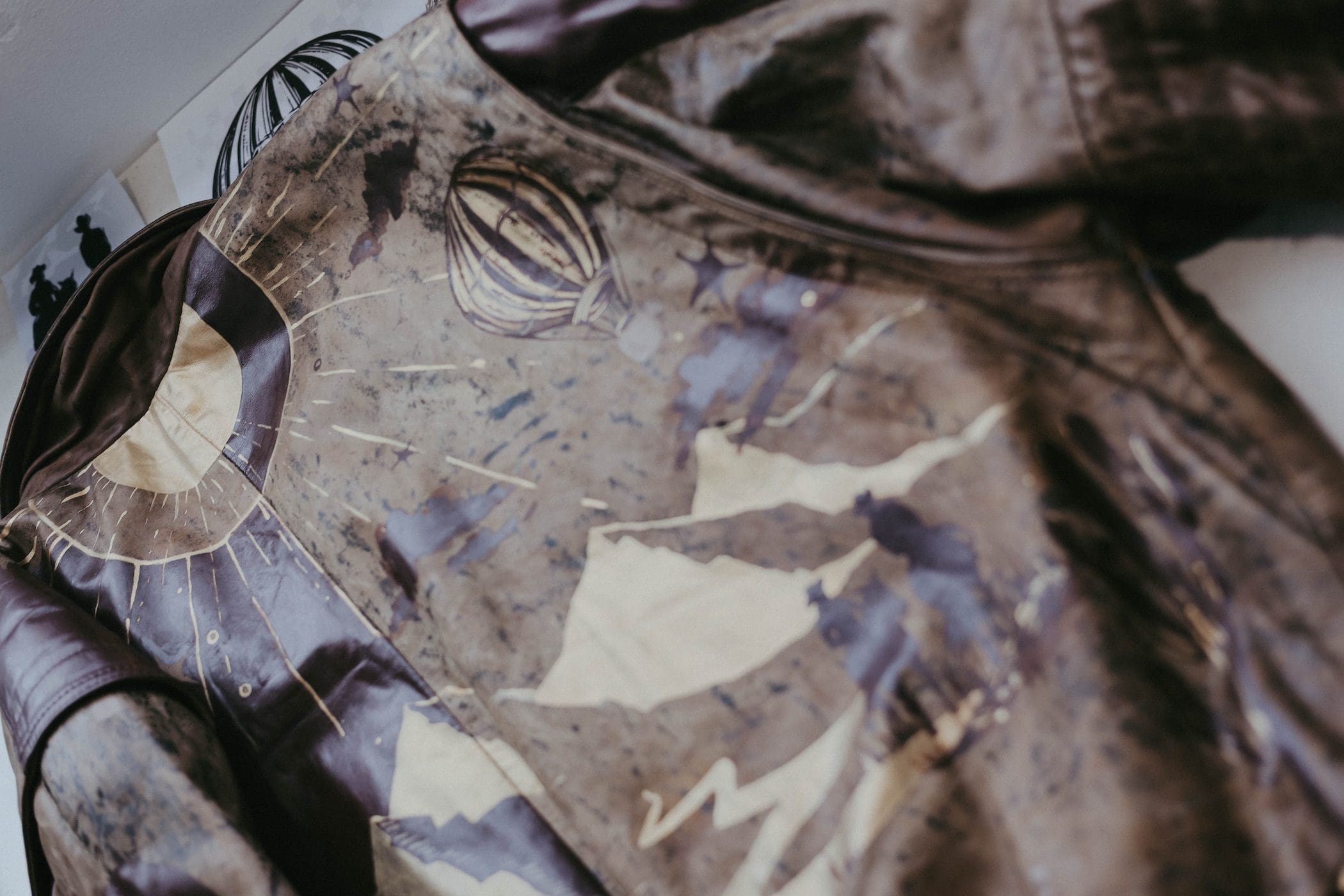 Caelyn besorgte sich eine gebrauchte Lederjacke und begann, sie zu bemalen. Bleistiftskizzen zeigten ihr, wo die einzelnen Symbole hinkommen sollten. Stück für Stück malte sie sie direkt auf die Jacke. Was als schlichte schwarze Jacke begann, wurde schließlich mit Kompass, Heißluftballon, Bergen, Pferden und all den anderen Spuren der Reise verziert.