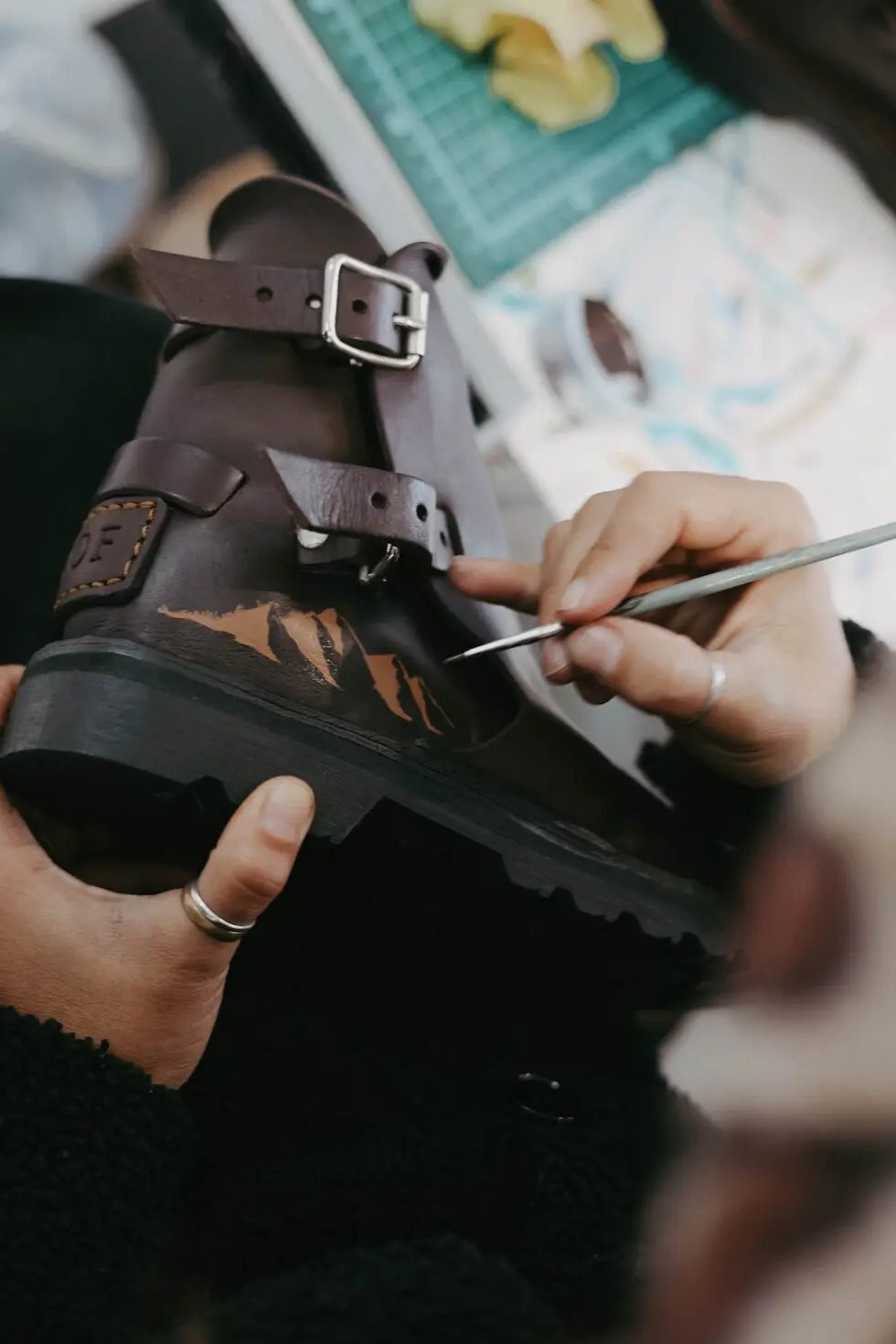 Gleichzeitig arbeitete sie an einem Paar brauner Tankwa-Stiefel. Anstatt sie mit all den Symbolen zu füllen, bemalte sie sie mit weiten, goldenen Dünen. Sie wurden so zu einem Spiegelbild Namibias selbst, der Wüste, die den ROF-Stil so stark geprägt hat.
