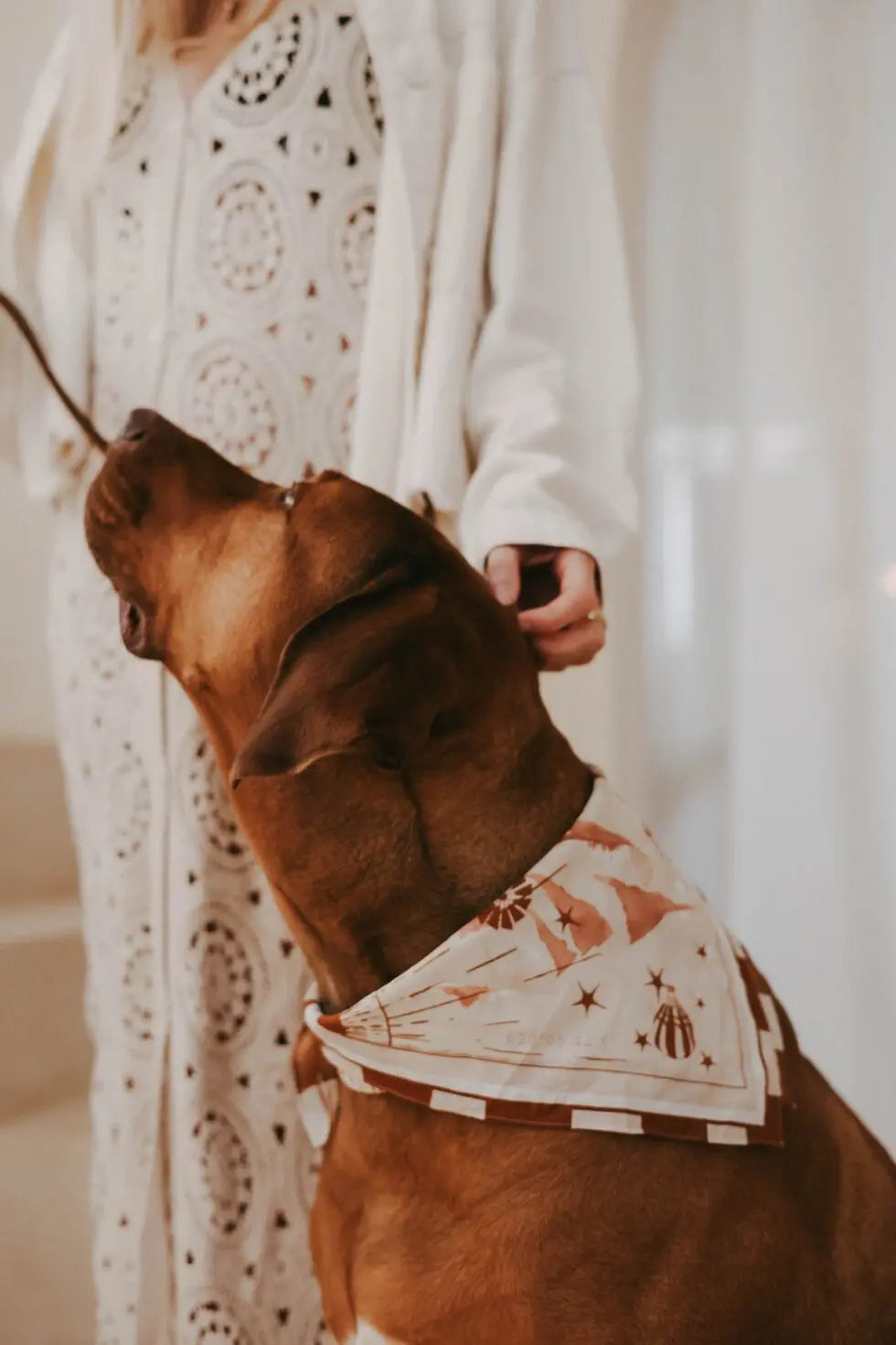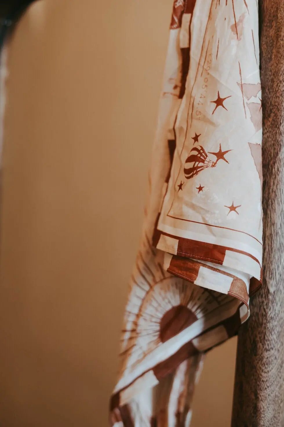 Wir wollten das Kunstwerk einem breiteren Publikum zugänglich machen, nicht nur als Einzelstück. So entstand das Journey Bandana. Es wird in Südafrika aus 100 % Baumwolle bedruckt, trägt alle Symbole und ist so gestaltet, dass es sich mit jedem Schritt mitbewegt. Manche tragen es um den Hals, andere an ihrer Tasche oder binden es sogar ihrem Hund um. Es ist leicht, schlicht und erzählt dennoch die ganze Geschichte.