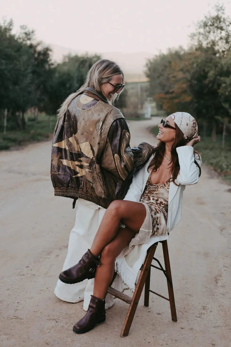 Das Journey Bandana machte das Kunstwerk zwar zu einem tragbaren Accessoire, aber Caelyn und ich wollten auch eigenständige Stücke kreieren, die diese Zusammenarbeit unterstreichen. Daher kamen die handbemalte Lederjacke und die Tankwa Boots ins Spiel.